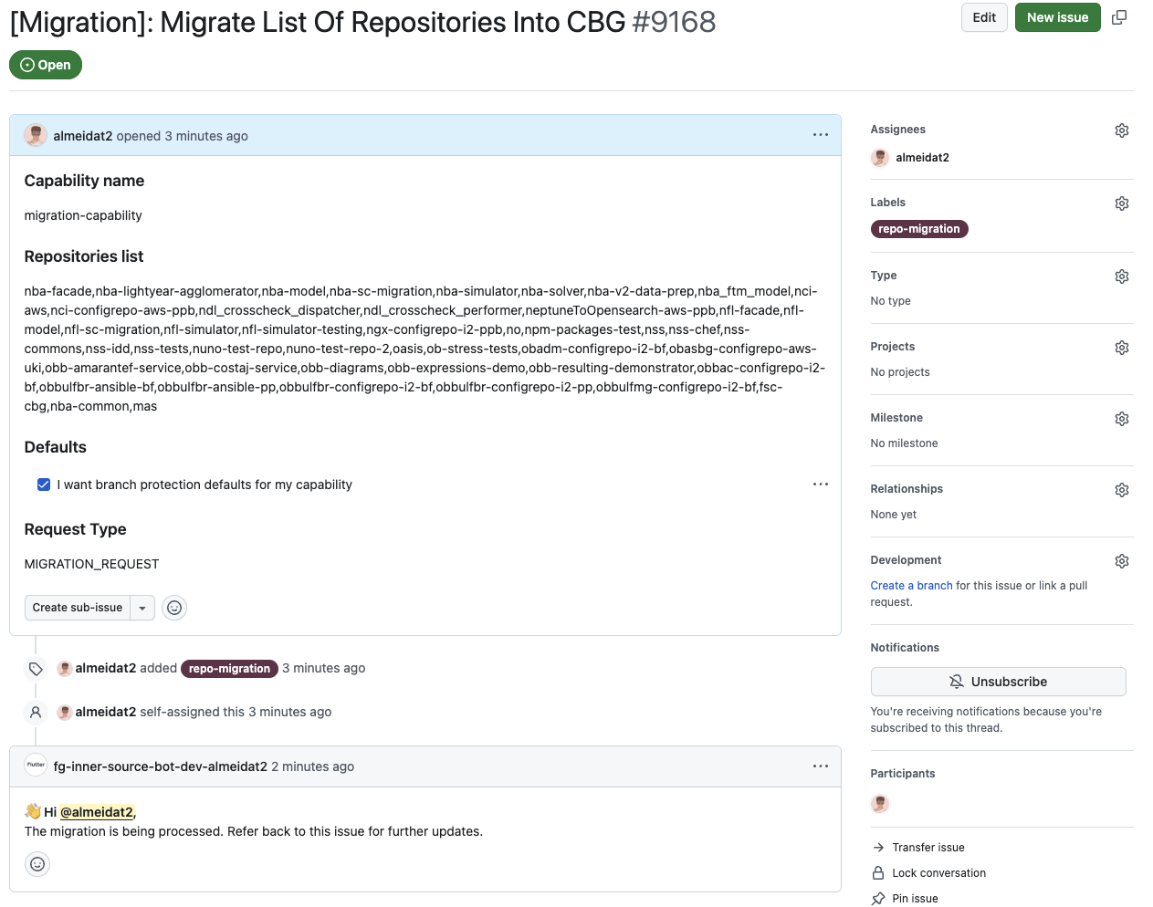 After the issue is created, an automation will start processing the migration. Updates will be sent to the issue as the automation runs, keeping the issue open until it is closed automatically: